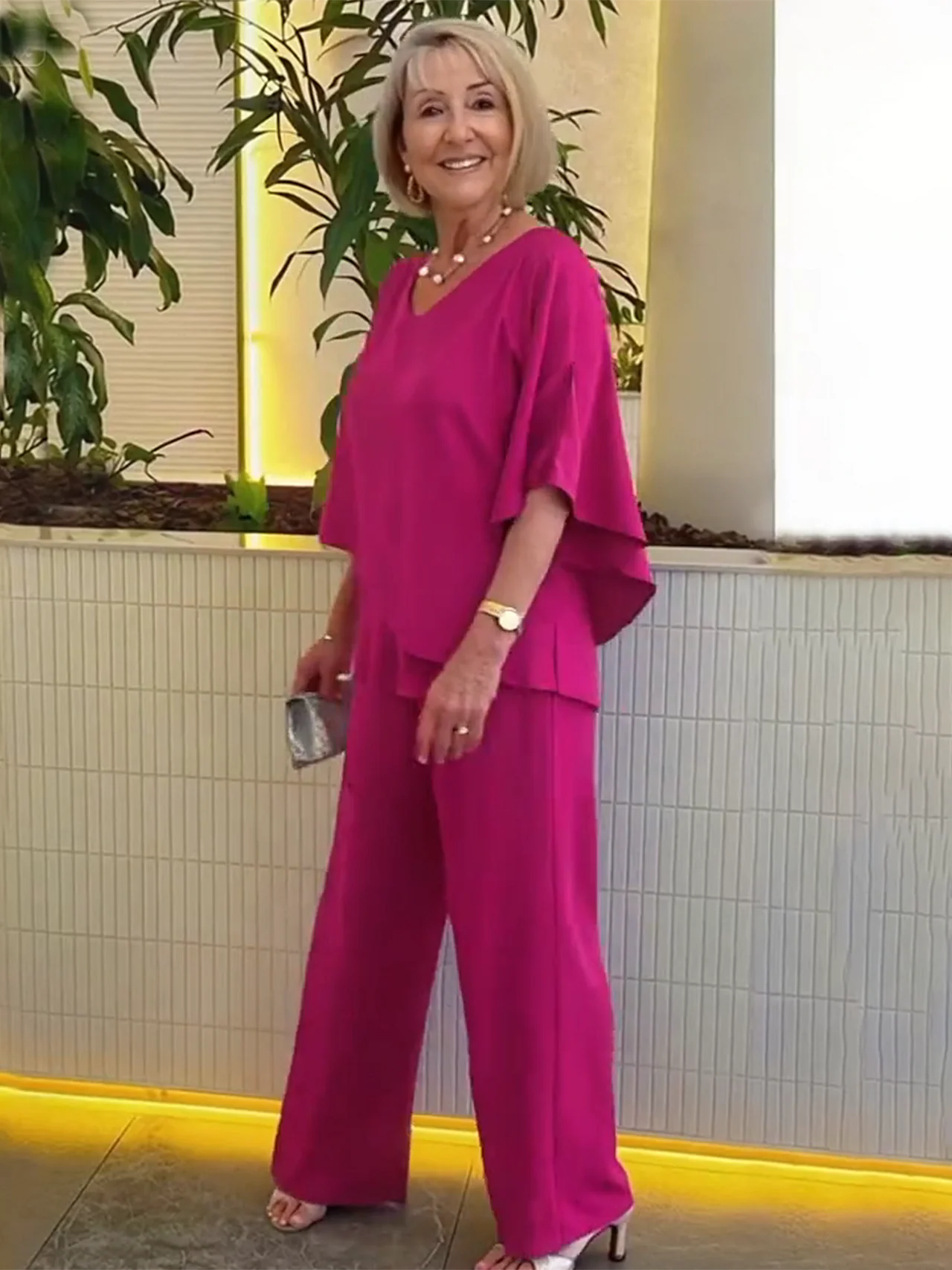 • Set Includes: Relaxed-fit draped top + matching wide-leg trousers